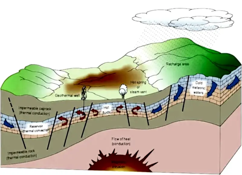 Magma, yeryüzünün yüzeyine yaklaştığında, kırık kaya yüzeyleri ve fayları boyunca uzanan gözenekli kaya veya suya sıkışan yeraltı suyunu ısıtır. Hidrotermal özelliklerin iki ortak bileşeni vardır: su (hidro) ve ısı (termal).